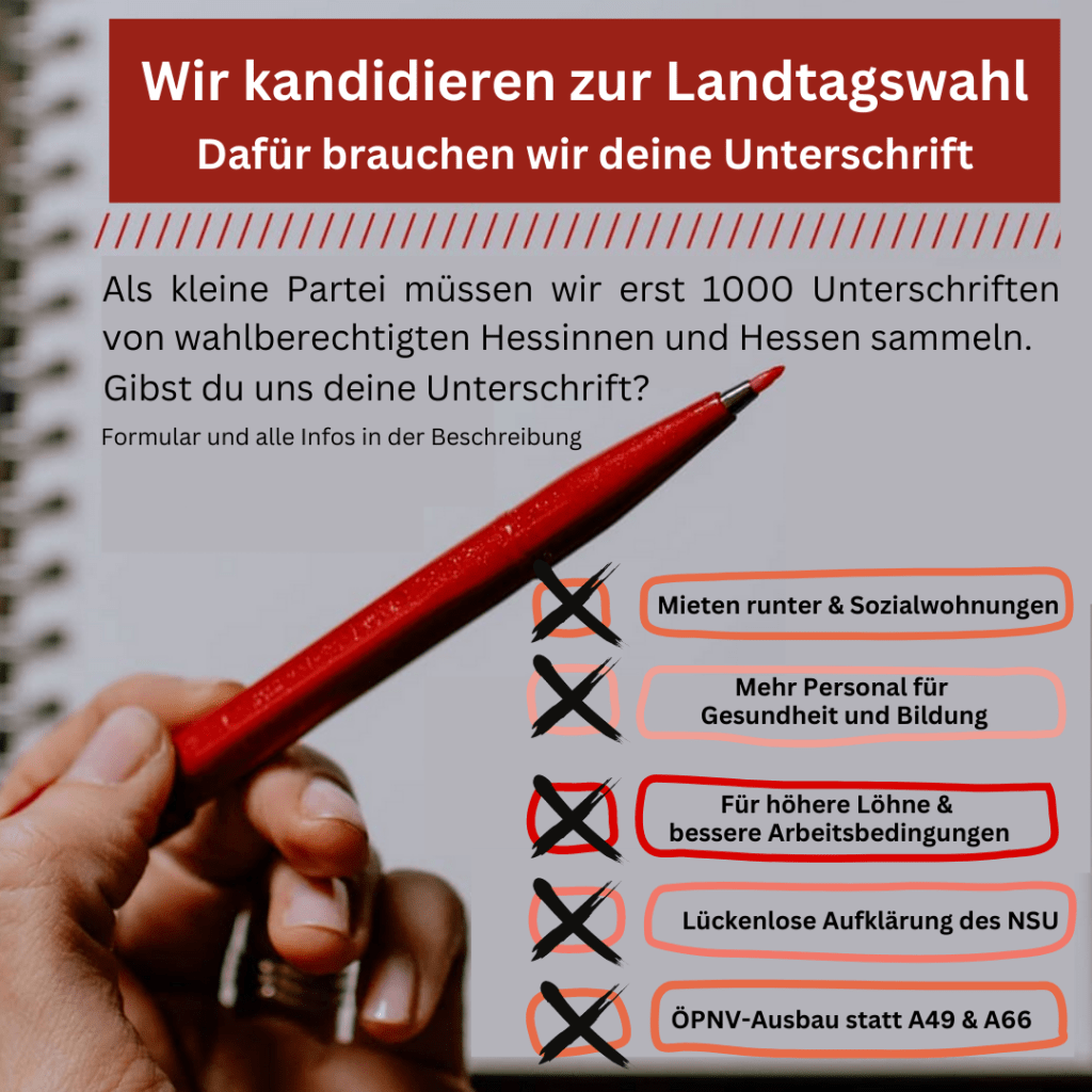 Auf Grund der geltenden Wahlgesetze müssen Parteien, die nicht im Landtag vertreten sind, 1.000 Unterstützungsunterschriften vorlegen, um zu den Wahlen zugelassen zu werden. Die DKP – Hessen hat unmittelbar nach dem Beschluss der Landesliste dem Landeswahlleiter ihre Teilnahme an den Landtagswahlen angezeigt und sammelt jetzt die notwendigen Unterschriften.