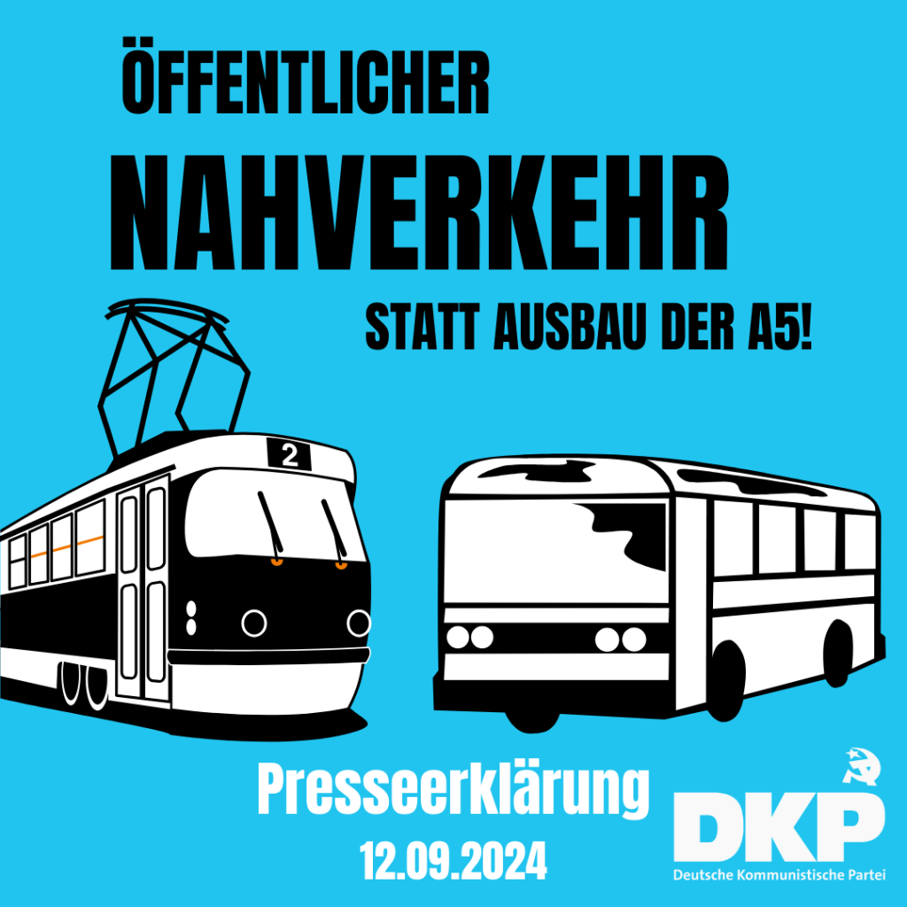 Die DKP Frankfurt am Main fordert genügend Geld für den Ausbau des Öffentlichen Personennahverkehrs und die Einstellung von weiteren Kolleginnen und Kollegen im Schienenbahnverkehr und eine Arbeitszeitverkürzung zur Entlastung aller. Von einem guten und ausgebauten Öffentlichen Personennahverkehr profitieren alle Frankfurterinnen und Frankfurter. Zudem ist ein gut ausgestatteter Nahverkehr auch ein dringend benötigter Faktor