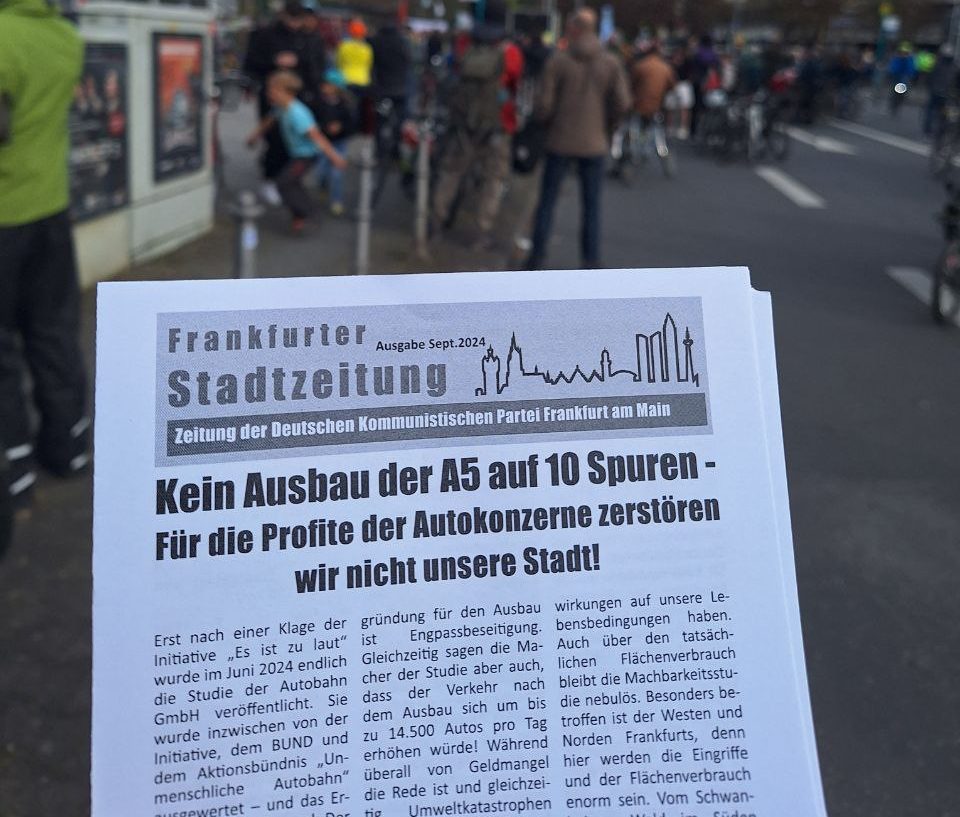 Die neue Ausgabe der Frankfurter Stadtzeitung unter dem Titel „Kein Ausbau der A5 – Für die Profite der Autokonzerne zerstören wir nicht unsere Stadt!“ ist erschienen!