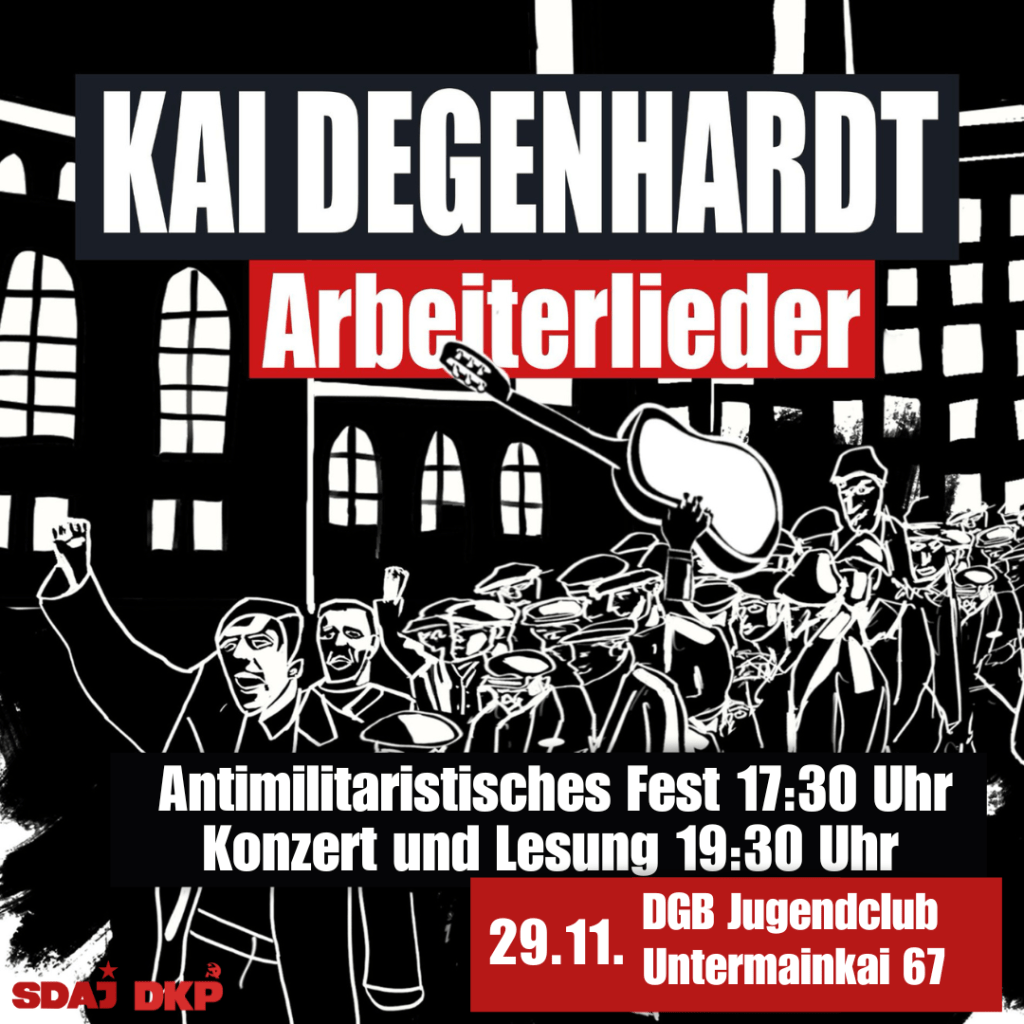 Ab 17:30 Uhr findet am gleichen Ort ein antimilitaristisches Fest der SDAJ Hessen statt – in Zeiten von Wehrpflicht und Kriegstüchtigkeit notwendiger denn je.
